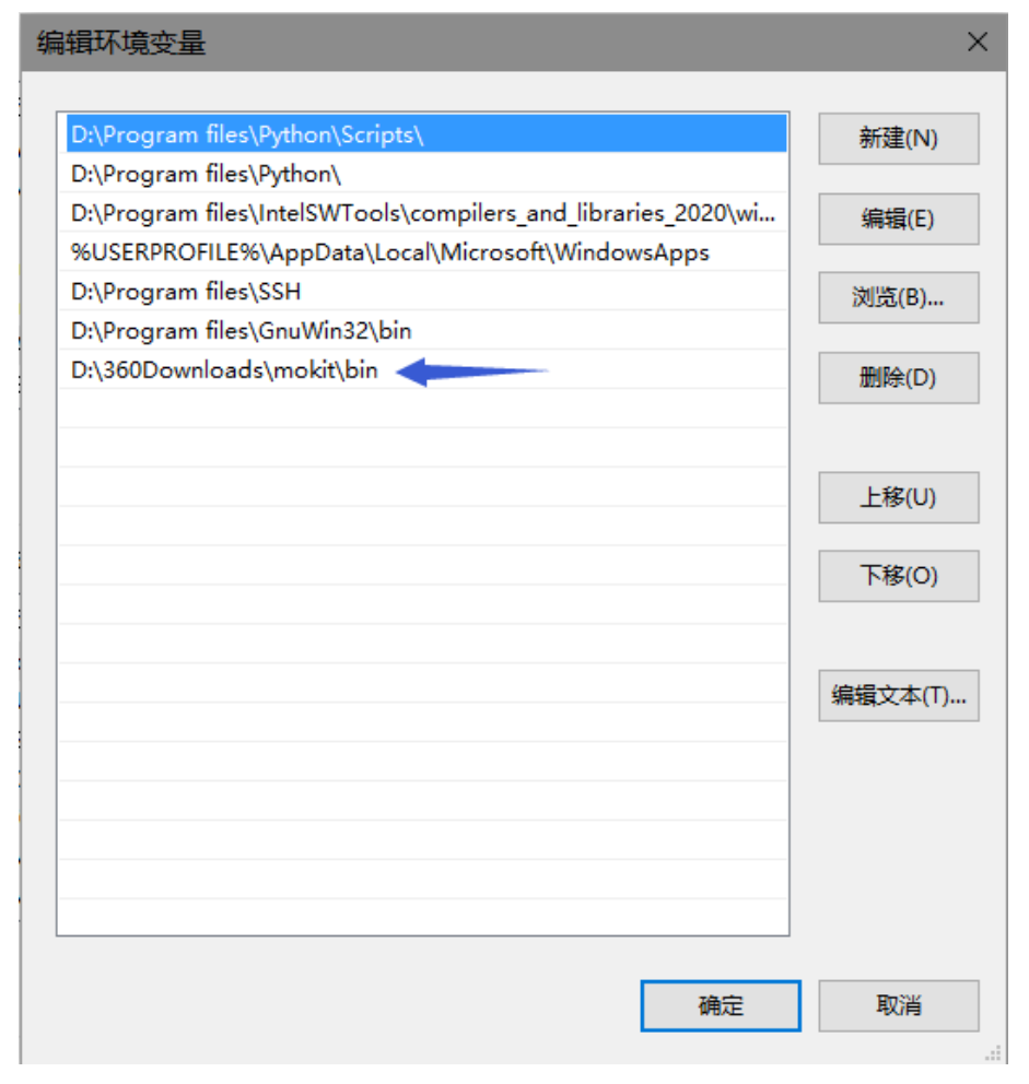 To set the environment variables, search 'environment' ("环境变量" in Chinese) in the Windows search bar, then press Enter and click Edit to edit the PATH variables. Create a new path and type the path of MOKIT binary directory. For example, on my computer the path is D:\360Downloads\mokit\bin.